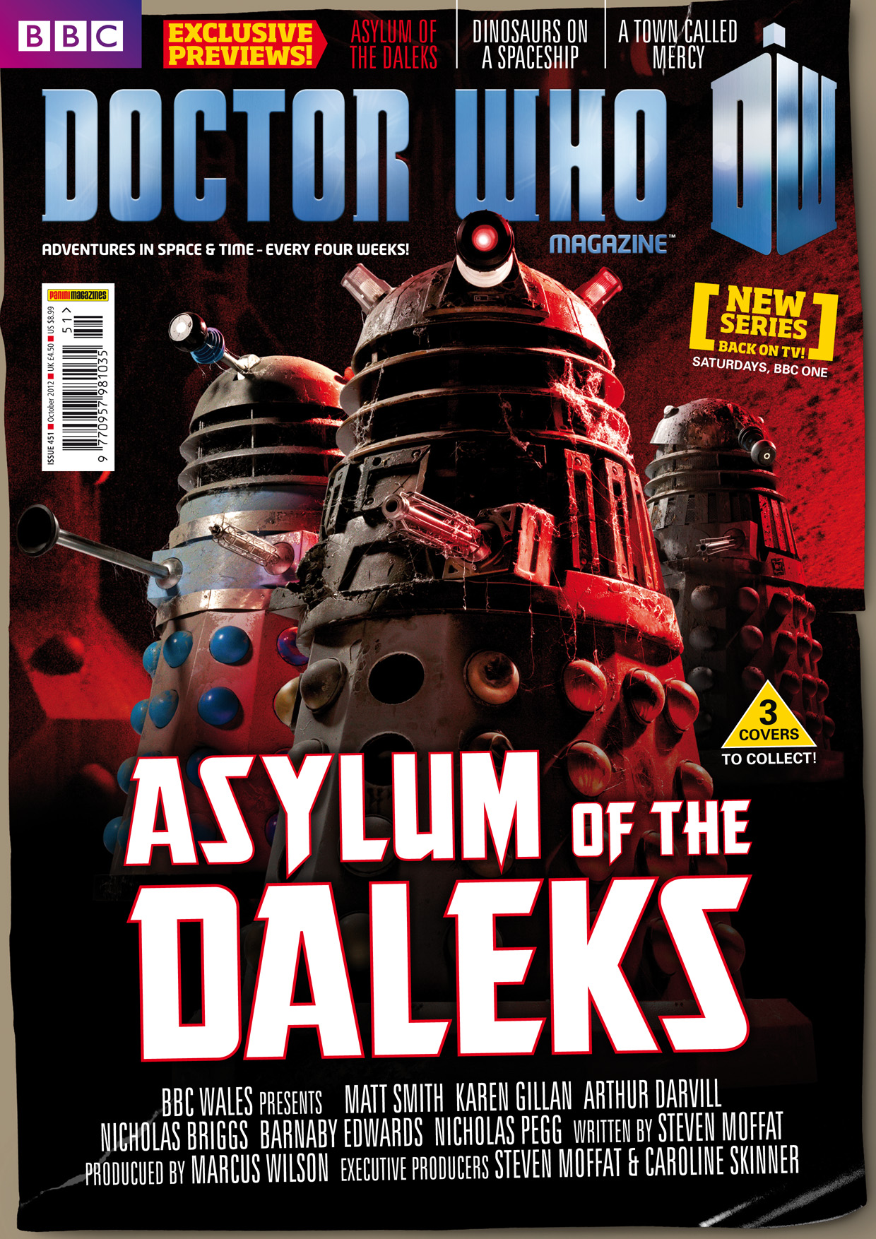 - Asylum of the Daleks – DWM takes over the Asylum for Doctor Who's most ambitious episode yet. Matt Smith shares his thoughts on the Doctor’s arch enemies, Steven Moffat on the challenges of keeping the Daleks fresh and how Arthur Darvill and Karen Gillan feel about the beginning of the end for Rory and Amy.