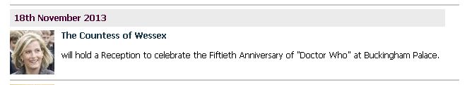 In what is arguably the biggest honour that could be bestowed on the show in its very special year, the Countess of Wessex - who is believed to be something of an admirer of the programme - will host the reception on Monday 18th November as the countdown to Doctor Who's golden milestone reaches its final few days. The guest list has been kept under wraps, but people involved with the show both in front of and behind the cameras over the years are expected to be on it.