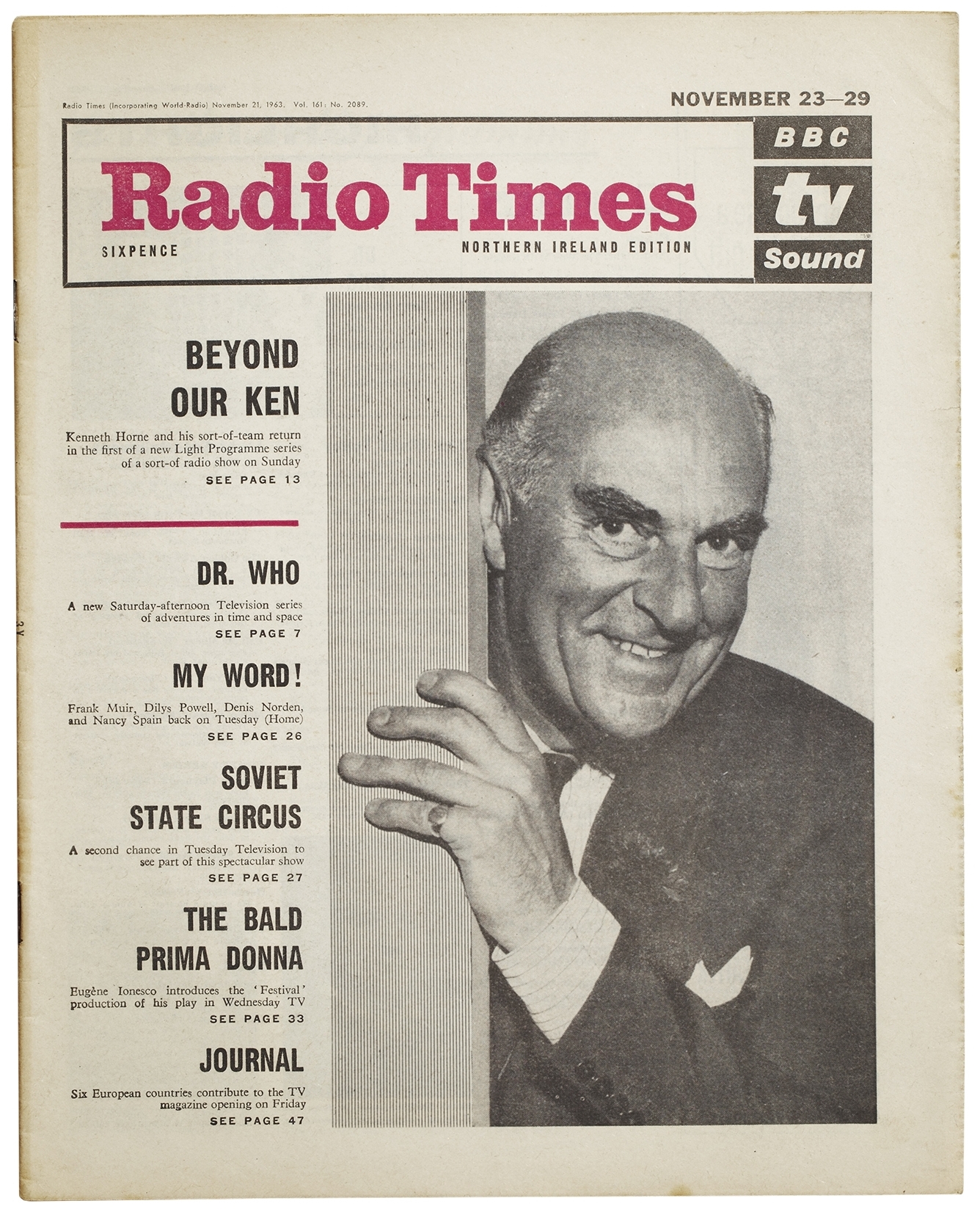 Unfortunately however, Williams would not be swayed, and Doctor Who did not eventually feature as the cover story of the 23-29 November edition of the Radio Times. As the name of the magazine implies, when it was originally launched it carried only radio listings, and even by 1963 it was still not at all uncommon for the magazine to feature a popular radio programme on the cover in preference to a TV show. In this case, the magazine chose to focus on the return of the popular radio comedy series Beyond Our Ken on the BBC Light Programme (now BBC Radio 2) on Sunday 24th November, with a cover photograph of the show's star, the comedian Kenneth Horne.