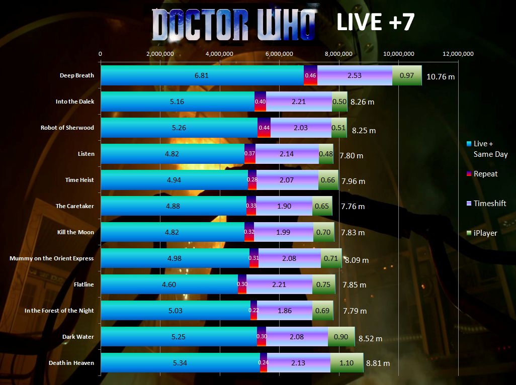 Live +7 figures give a fairly consistent ratings across the series, with almost 10.8 million tuning in for the twelfth Doctor's debut. The average rating drops to around 8 million for the rest of the series with Death in Heaven finishing with around 8.8 million watching.