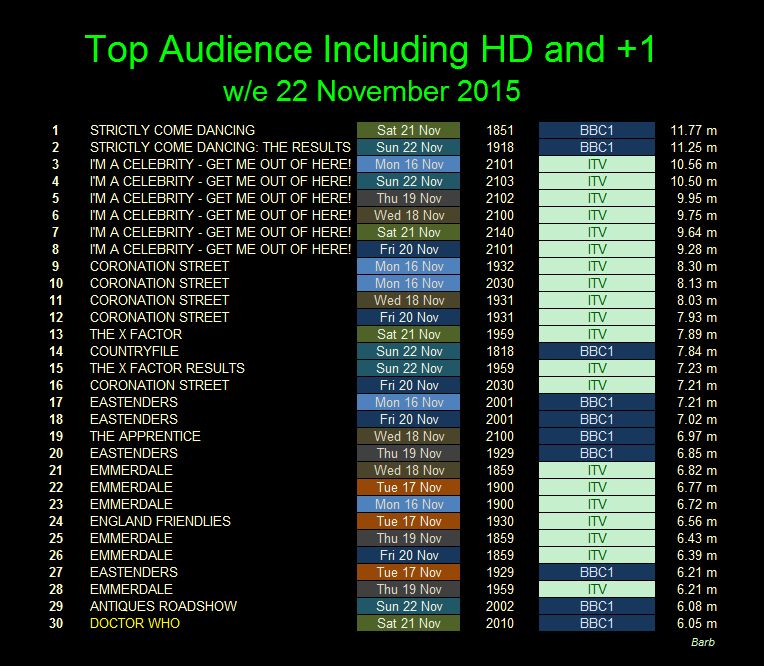 Strictly Come Dancing topped the ratings for the week with 11.77 million viewers. The top ten was dominated by the latest series of I'm a Celebrity, Get me Out of Here taking six of the top ten places.