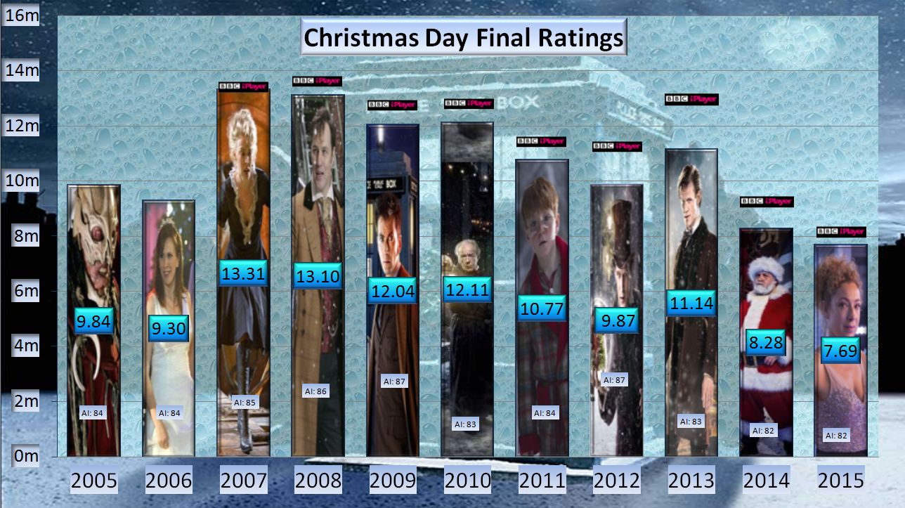 Doctor Who was 8th for the week and 7th for Christmas Day. It achieved higher ratings than the ubiquitous soaps Coronation Street, EastEnders and Emmerdale.