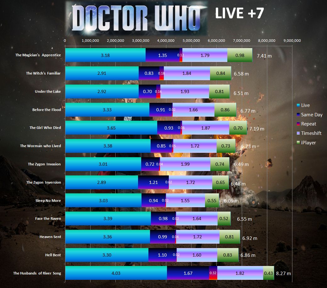 The figures show an average of 60% of the audience watch Doctor Who on the day of transmission, either as a Live broadcast or as a delayed viewing via a PVR. The number is slightly higher for the series finale and the Christmas spacial. A further 26% of the audience watch the programme, via a recording, within 7 days of the original transmission. The highest delayed viewing was for The Zygon Invasion.