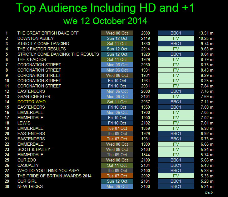 On Sunday, six programmes scored higher than Doctor Who, pushing the show into 29th place for the week. Final figures and chart position will be released next week.