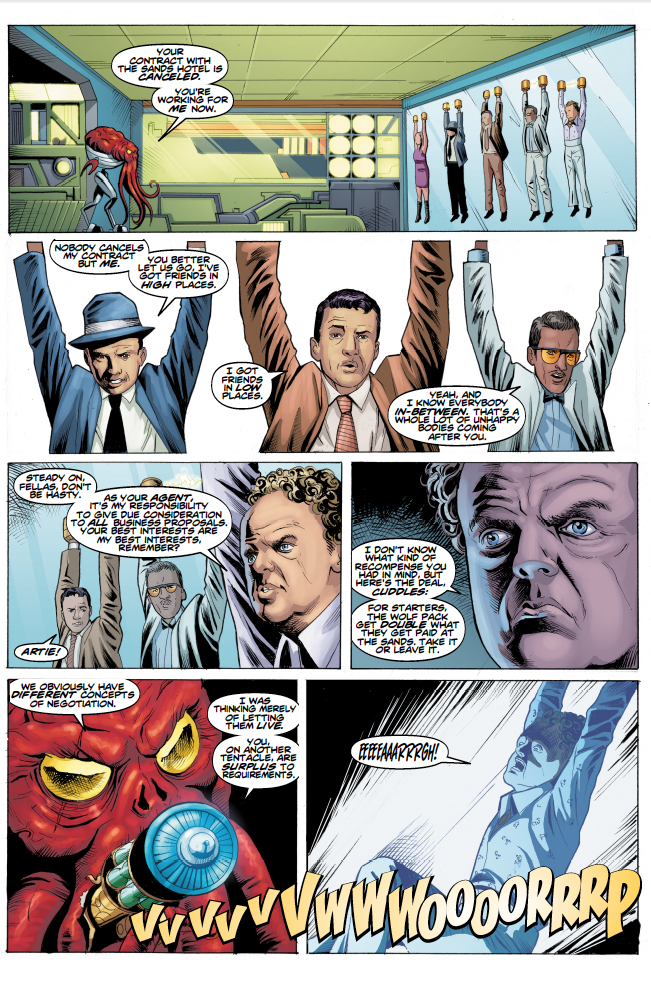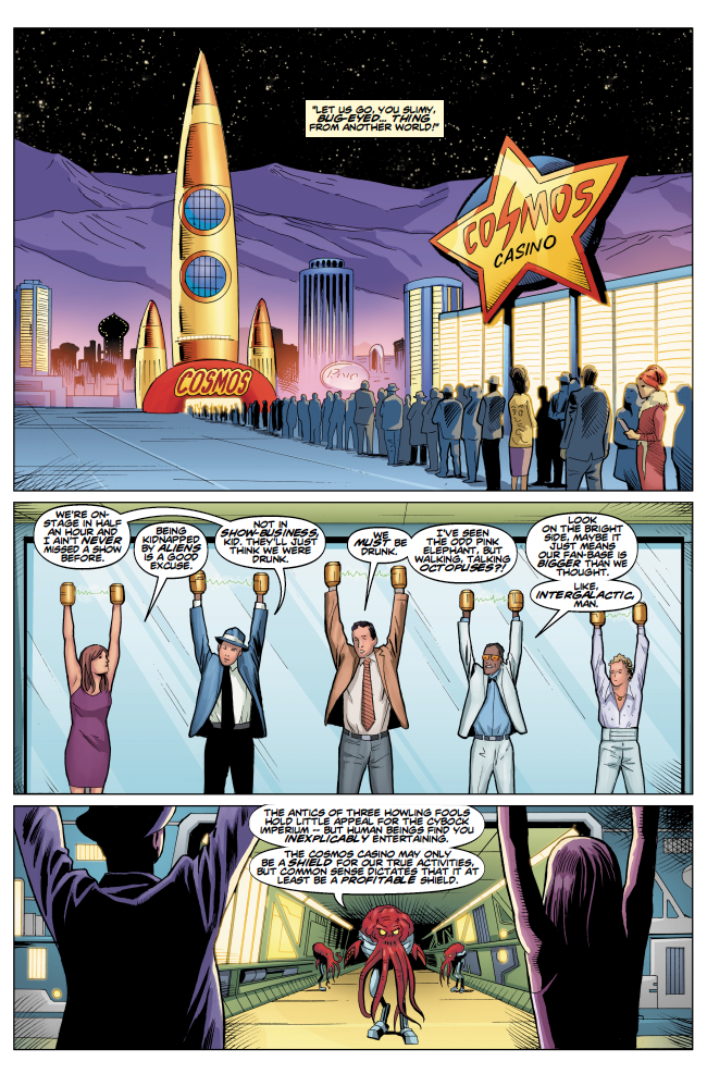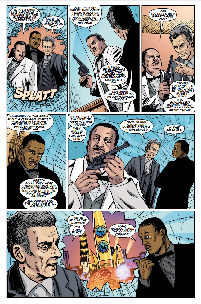 The Ninth Doctor, Jack and Rose are caught between a heavily-armed intergalactic standoff, while The Tenth and Twelfth Doctors are Earthbound, Stateside. The Tenth Doctor is challenged with protecting New York city from an ominous looming pyramid and the Twelfth Doctor and Clara take on a toxic mix of mobsters and invading aliens in 60's Vegas!