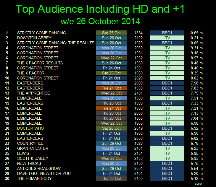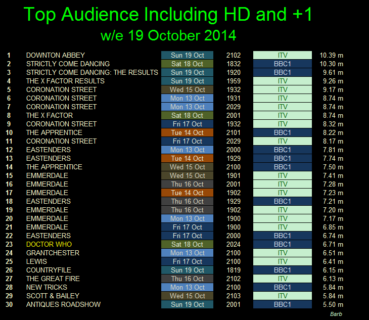 Top for the week was Strictly Come Dancing which had 10.65 million watching, just above ITV's Downton Abbey, with 10.21 million viewers.
