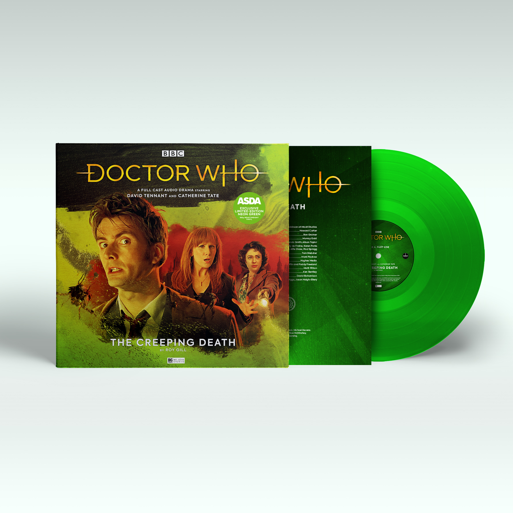 ASDA will launch Doctor Who: The Creeping Death starring David Tennant and Catherine Tate on Friday 24th May 2019. It will be released as a Limited Edition run of 1,000 copies on neon green vinyl – only available in the UK.