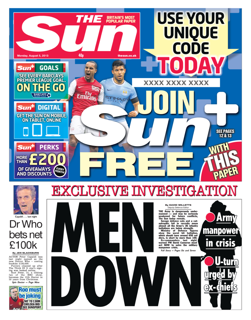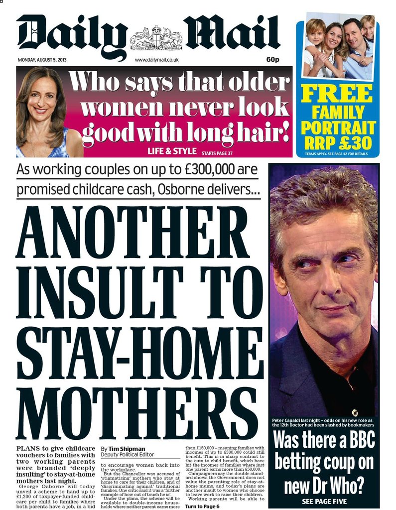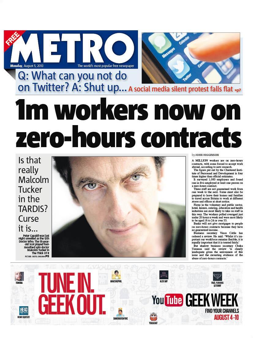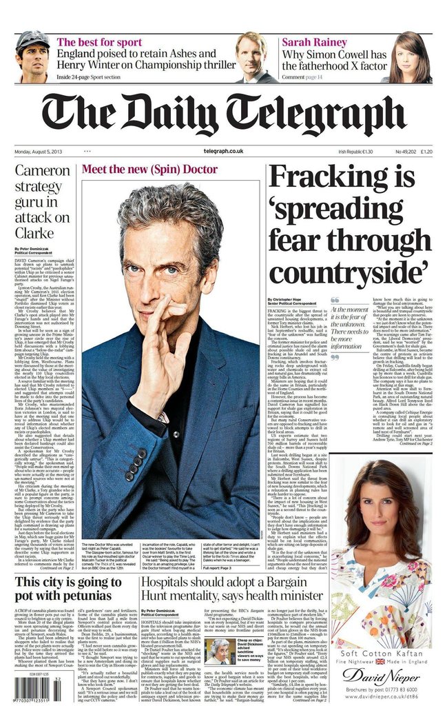 The news of Peter Capaldi becoming the Twelfth Doctor made the front pages of several Monday editions of British Newspapers, including the Times, Guardian, i, Telegraph, Express, Mirror, Sun and Daily Mail (with the latter two focussing on the betting patterns over the last week).